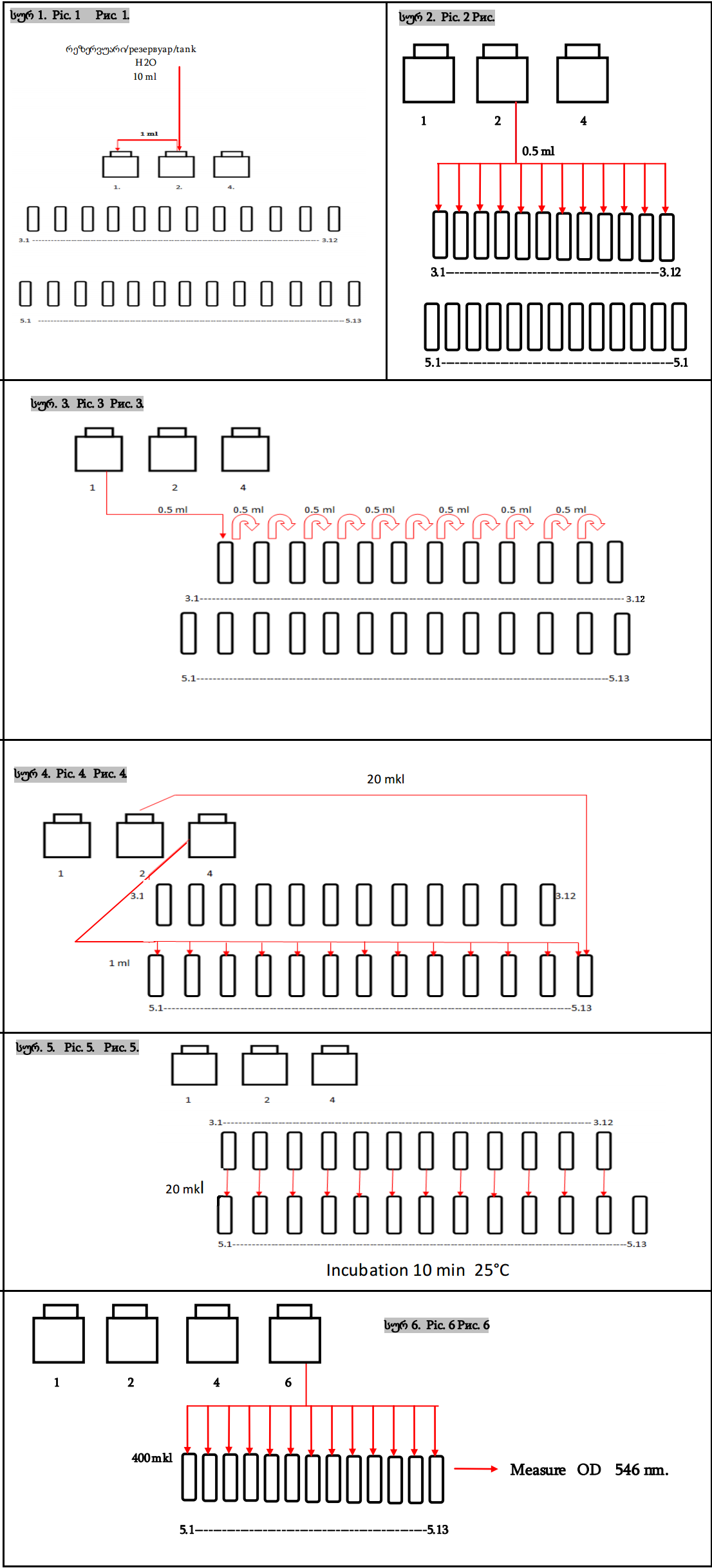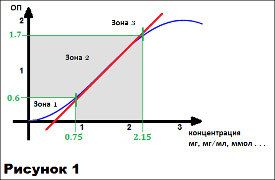 где А - оптический показатель стандартного раствора, О - концентрация соответствующего стандарта, А1 - оптический показатель искомого раствора, Х - концентрация, искомого раствора. Пример (см. рис. 1). Значение оптической плотности стандартного раствора должна соответствовать 1,7 OD (см. рис1). Предположим, что OD -исследуемого раствора 0.6, тогда согласно пропорции, Х=0.6 X2.15/1.7. Получаемое значение Х=0.75 - соответствует графическому показателю. Расчёт с применением фактора F (применяется в тех случаях, когда реактив, очень стабилен). Расчет с применением фактора, является упрощённым методом расчёта, со стандартом так так конечной формулой в расчёте, со стандартом является Х=А1 * О/A гдеО/A-параметры известного стандартного раствора, и поделив одну на другую получаем фактор .-F т.е стандартный раствор измеряется один раз на серию замеров образца.расчитывается фактор (F) О/А=F. Полученое значение образца просто умножается на флакон (F). Пример см. рис. 1. Измеряется ОП стандартного раствора например .2.15мг/мл . Значение оптической плотности стандартного раствора должна соответствовать 1.7 ОП (см.рис.1). Рассчитывается фактор F=2.15/1.7, F=1.26. Предположим, что ОП-исследуемого раствора 0.6. Тогда согласно пропорции Х=0.6*F т.е. Х=0.6*1.26 т.е. Х=0.75. Получаемое значение 0.75- соответствует графическому показателю и рассчитанному со стандартом. Все три варианта подсчёта правомерны если эксперементальные данные находятся в зоне-2 см.рис.1. Показатели, концентрированной сгущённой сыворотки, должны оказаться в зоне 3. Поэтому данная проба разбавляется в четыре (4) раза физиологическим раствором и измерение производится заново. В связи с тем, что проба, разбавляется в 4 раза после проведения расчётов полученное значение, умножается на число разведений т.е. 4. Расчёты можно проводить любым из вышеописанных трёх методов.