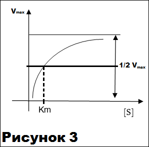 Студент, на этом этапе развития, может измерить глюкозу, являющуюся продуктом гидролиза сахарозы, и белок, то есть фермент катализирующий реакцию. Соответственно вводится понятие фермента. В данном случае инвертазы, субстратом которой является сахароза. Но студент ещё не готов обсуждать активность, поскольку главная проблема взаимосвязи фермента [Е] и субстрата [S] для него ещё не ясна. Основным постулатом является взаимосвязь [S]=10Км. По этому прежде чем мы будем измерять активность, студент должен определить Км, рассчитать точную концентрацию субстрата, времени, температуры, т.е. должен смоделировать метод определения активности и только потом проводится измерения называемое активностью. Берется избыточная концентрация сахарозы, добавляетсяфермент, и за минимальный промежуток времени (время достижения максимальной детекции продукта ) измеряется глюкоза, как продукт. В последующих опытах, разбавляется сахароза (концентрация фермента, и время, не меняются) пока не начнёт уменьшатся скорость реакции. Достигнув показателей уменьшения скорости реакции инвертазы за счёт уменьшения концентрации субстрата, строится график зависимости скорости реакции от концентрации субстрата. Полученная зависимость, изображает уравнение Michaelis-Menthen (Km), (см. рис.2).