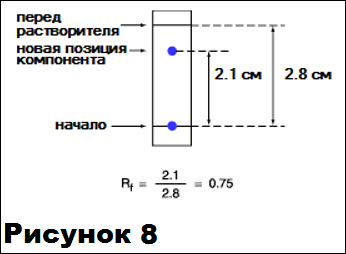 Например, если органический состав прошел 2.1 см, а растворитель – 2.8 см, то Rf= 0.75: